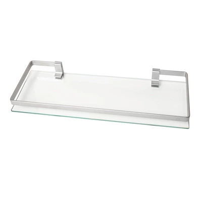 This floating glass shelf with brushed chrome railing is both, a perfect contemporary accent and a functional storage space for your bathroom. The 20-inch-wide tempered glass provides enough space to keep your toiletries within easy reach while the decorative brushed chrome railing keeps them safely in place. Includes all mounting hardware for easy installation.