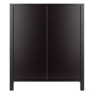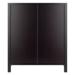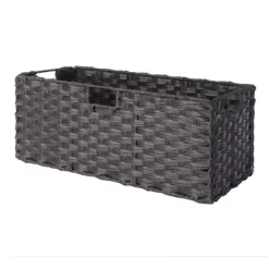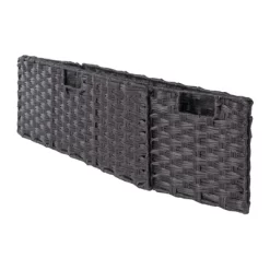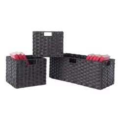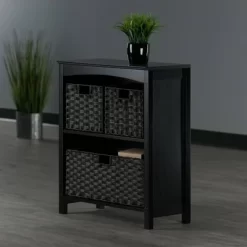 Enhance the appearance of any room with the simple yet attractive design of the Winsome Wood Terrace 4-Piece Storage Shelf Set. Spacious shelf perfect as a standalone bookcase in the home office or displaying family portraits and treasures in the living room. Finished in a rich espresso and made of solid and composite wood for long-lasting durability. The set of baskets are woven in durable flat polypropylene in a chocolate finish and have two cut out handles, one on each end, for carrying purposes. Two small baskets that are 10.24”W x 11.02”D and one wide that is 10.24”W x 11.02”D, bring charm and style to this set. They are great for decorative storage and organization. Or fold up for compact storage taking up almost no space. So, whether you need it in the mud room for shoes, laundry room for the towels and detergents, or as a display shelf in the living room, this 2-section shelf offers stylish organization for all your essentials. This set is shipped in two boxes. The shelf will ship separately and will include the hardware necessary for assembly.