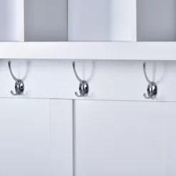 This modern hall tree is just perfect for both stylish home and functional organization. The lower compartment features 2 adjustable shelves that create six spacious areas that are flexible enough to accommodate items large and small. Whether you’re storing tall boots or small sandals, these open shelves have you covered. The open area above the lower storage space is the perfect place to sit and put on your shoes and jacket.