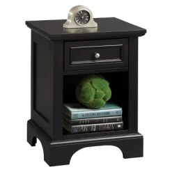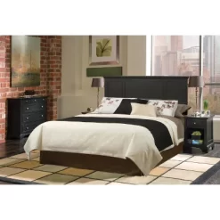 homestyles Bedford Queen headboard, Nightstand, and Chest are constructed of hardwoods and engineered wood with a rich black finish. Headboard features include raised panels on the headboard. Headboard will fit most Queen bed frames. Item Size: 65w 2.5d 52h. Nightstand features include a storage drawer that measures 10.75 w 10.75 d 4h, and open storage area that measures 12w 14d 11.5 h. Item measures: 18w 16d 24h Four drawer chest features include four large drawers. Top drawer measures 28w 13d 2h the remaining drawers measure 28w 13d 6.5 h. Item measures: 36w 16.5d 36h