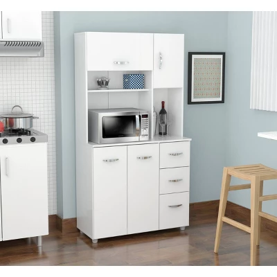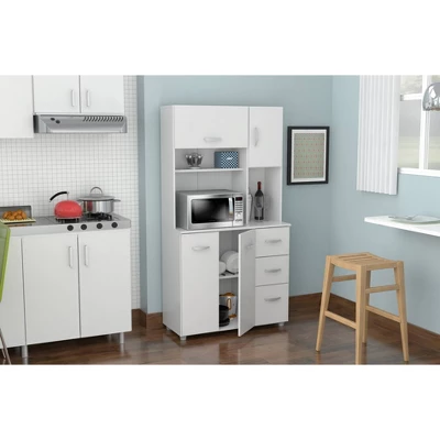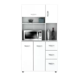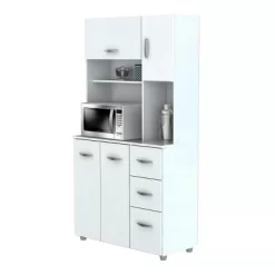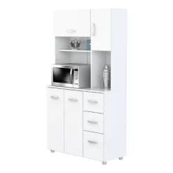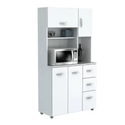 Microwave Storage Cabinet by Inval, finished in rich “White” laminate in durable melamine which is stain, heat and scratch resistant. Constructed from manufactured wood. This storage cabinet with space for a microwave features four doors which conceal ample storage space, as well as three drawers with slides for accessories. All doors and drawers have brushed metal handles.