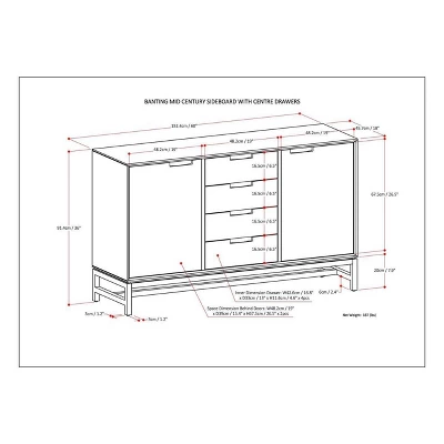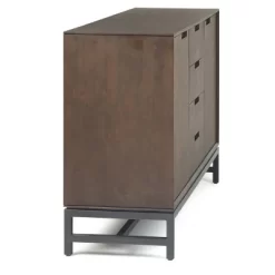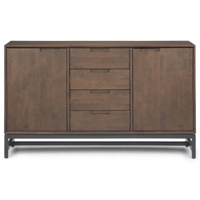 The Devlin Collection is made from richly-grained solid Rubberwood stained in a deep walnut brown finish. This mid-century modern industrial collection has a clean angular metal base, with square, simple modern drawer and table top. With no visible hardware, and only simple wood pull handles, the solid Rubberwood top, is simple and uncomplex. The Devlin 60 inch Sideboard Buffet has four working drawers with full extension ball bearing drawer glides and two doors opening to large storage space with two adjustable shelves each to maximize functionality. The Devlin collection includes coffee, console, end tables, tv stands, sideboard buffet, desks and bookcase.
