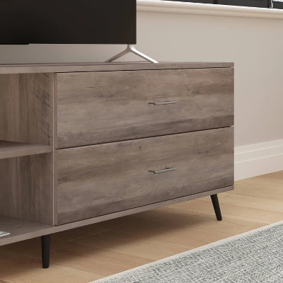 Retro style blends with 21st century functionality in this mid-century modern inspired media console. Durably constructed and designed with ample storage with adjustable open shelving and two drawers. A cable management hole helps to reduce visual clutter in your home for a neat, organized space.