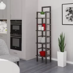 The Aiden Narrow Baker’s Rack by Winsome combines the styling of an antique Tuscan baker’s rack with a contemporary shelving unit that’s perfect for smaller spaces. Bring a touch of open-concept styling to your kitchen where the rack can keep a basket of fruit, mixing bowls, and a few bottles of wine. Or use it in the living room to array your favorite plants, framed photos, or books. The rack also makes an ideal shelf unit in the bathroom for guest towels or decorative items. Made of Solid Wood in a rich Coffee finish, it has four shelves with nearly 15″” of clearance between shelves for taller items. An ideal piece for apartment living or smaller rooms, the open styling provides storage with an airy feel. Shipped in one box with hardware needed for assembly.