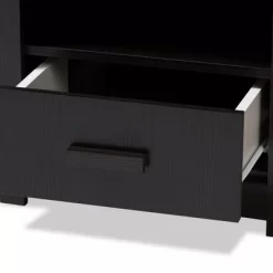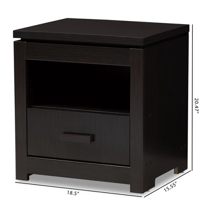 The Bienna nightstand is the minimalist, simple storage solution you’ve been looking for. The modern and contemporary-inspired design is exemplified in this nightstand’s straight, clean lines. The Bienna is finished in a wenge and with a matching drawer handle, mait easy to coordinate with your existing decor. This nightstand has one convenient open compartment, which can be used for storage or decor. The Bienna features one pull out drawer, helping you to tidy up any clutter at your bedside. Complete the look of your bedroom or guestroom with this modern, stylish nightstand. Made in Malaysia, the Bienna requires assembly. Dimensions: 20.47″ High x 18.5″ Wide x 15.55″ Deep