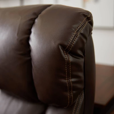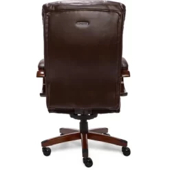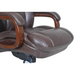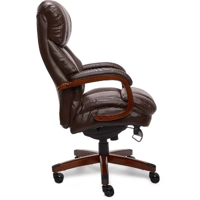 Specially designed to support up to 400 pounds, the La-Z-Boy Fairmont Big and Tall Executive Office Chair offers advanced performance features for exceptional comfort during work or play. This spacious and ergonomic office chair features memory foam cushions, which are made with an advanced layering system that offers zone-based support with cushioning in the areas you need it most. Strategically placed plush body pillows and a padded headrest combine to provide neck support and minimize pressure points. The fully adjustable controls, including height, tilt, and lift adjustments, ensure optimized body alignment and a personalized fit. Created with industrial-grade components for reliable and long-lasting use, this leather office chair is constructed with a thick plywood sub core, reinforced back bar, and heavy-duty casters. Rich brown bonded leather and hand-sculpted wooden arms create an elegant blend of traditional style and modern performance that is ideal for any office, home, or entertainment space.