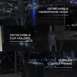 Gaming Desk & Chair Set – Reclining Gaming Chair with Slide-Out Footrest & Gaming Desk with Cupholder/Headphone Hook Additional Features: X-Shaped Powder Coated Frame, Detachable Cupholder/Headphone Hook, Cable Management Grommet