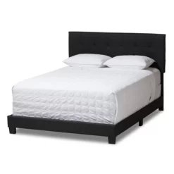 Stay and sleep in comfort with this Brookfield modern and contemporary dark charcoal gray fabric upholstered grid-tufting bed. Crafted with style and characters, the bed features stylish grid-tufting design which can accommodate most mattresses. Fitted with solid wood legs in black, the Brookfield provides stability and a stylish headrest. The entire headrest has been upholstered in high quality dark charcoal gray polyester fabric while grid-tufting design gives the piece a touch of sophistication. You’ll love having this inside your bedroom. It offers comfort with a touch of delicate retro feel. Made in Malaysia, the Brookfield requires assembly.