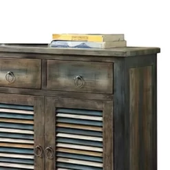 This Oak Teal Console Table from Acme Furniture is sure to be the perfect addition to your living room, dining room or entryway. Featuring a wooden construction in a distressed finish, this farmhouse-inspired console table has all the rustic style you’re after. Two top drawers offer storage space you’ll appreciate, and the dual cabinet doors are styled to look like shutters for extra visual interest. Use this table as an entertainment center, bar area or simply as a decorative element for a distinctive look you’re sure to love.