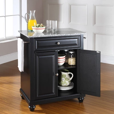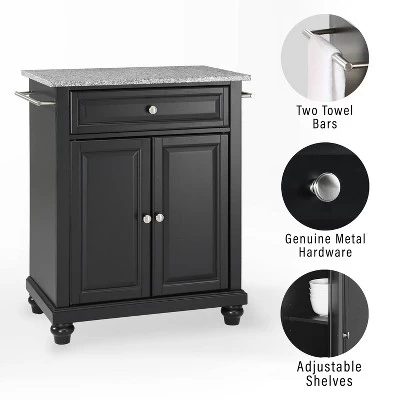Save valuable space with Cambridge Compact Kitchen Island. Featuring a large cabinet with an adjustable shelf, this island can easily store pots, pans, or small appliances. The large drawer will keep small items like utensils and dishtowels close at hand, while the towel bars on either side can be used for added hanging storage. With a beautiful granite countertop and classic turned feet, the Cambridge Compact Kitchen Island is a welcome addition to your kitchen space