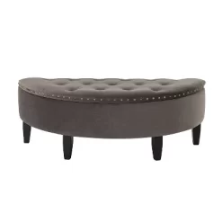 Add style and spacious storage to any room with this classic half-moon storage bench. Featuring a soft velvet polyester fabric with golden trim, this storage bench has solid wood legs in a black finish to complement any interior design style. This multifunctional bench can provide seating and double as a coffee table, serve as a bedroom bench, or as an entryway bench with storage. Premium details include a button-tufted design and a deep storage capacity. Easy to assemble and maintain.Item Size:43.3″W*17.3″D*15.7″H.