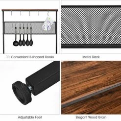Our Baker’s Rack is superior is quality and classic in design! Made of thicken board and iron tubes, the baker’s rack is sturdy and durable for a life span. It also does excellent in rust resistant with paint-coat on it. Adjustable feet provide great stability. 4-layer design, including 3 wooden boards and 1 grid layer, provides ample storage and classified space, making your home tidy and neat. Moreover, 11 S-hooks help to hang up objects like pans and ladles conveniently and effortlessly!