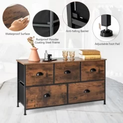 Costway 5-Drawer Dresser Fabric Storage Tower W/wooden Top Chest Organizer Rustic Brown - Image 5