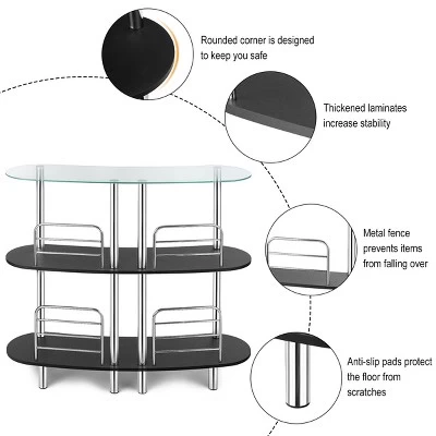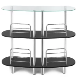 Our contemporary bar table is a good choice for home entertainment. Equipped with tempered glass top and 2 large shelves, this bar table provides you with ample space. Glamorous curved silhouette adds contemporary elegance style to your home. It looks exquisite in the dining room or living room, and could be used in more places for offering extra storage. Consisted of sturdy frame and tempered glass, it has strong load-bearing capacity. Besides, it is easy to assemble and clean, which allows you to spend less energy to keep it tidy.