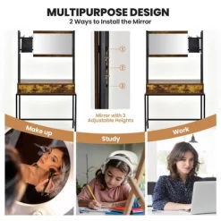 - Clear Mirror & 3 Adjustable Heights: This dressing table comes with a high definition mirror, offering you a clear view to make up and do your hair conveniently. And the mirror has 3 mounting heights (55.5”/57.5 ”/59”) which are suitable for people with different heights. And you can also install the mirror on either left or right side as you like.