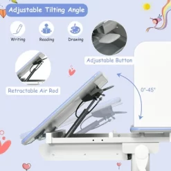 • Adjustable Height & Tilt Desktop: The height (from desktop to ground) can be adjusted by a handle from 21.5” to 31.5”, meeting the needs of kids of different ages and heights or accompanying your kids’ growth. Moreover, the tilt desktop can be adjusted within 0-45°, which is suitable for your kids to write, draw, read, etc.