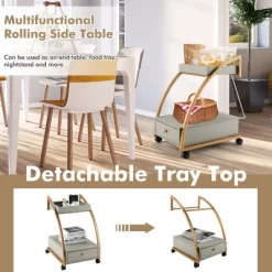 The 2-tier side table features a unique C-shaped frame integrates 3 storage spaces, including a tray top, an open storage shelf and a drawer, which can well keep your items in order. What’s more, there are 4 smooth casters to achieve flexible movement. Meanwhile, 2 wheels with brakes allow the side table to remain stationary while in use.Therefore, you can use this side table in various rooms, using it as a bedside table, sofa table, snack cart or coffee table. Moreover, composed of a sturdy steel frame and durable MDF material, the cart has a total weight capacity of 44 pounds. In addition, this side table has a sleek, modern design with grey linen-like surface and gold frame. It is definitely a practical and beautiful addition to your living space.