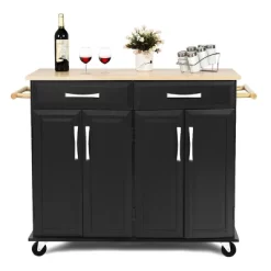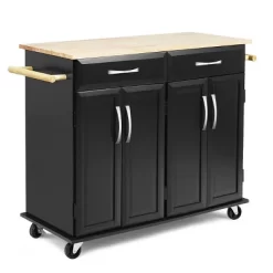 - 【Sturdy Kitchen Cart and Durable Use】: Made of high quality MDF and PB materials and processed with black finish, the kitchen island cart maintains long-lasting and stable. Rubber wood top is strong enough to hold utensils, wine bottles and glasses. Elegant and classic design is popular and can perfectly match your home decor style.