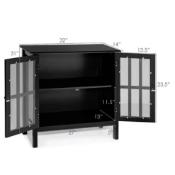 Functional storage cabinet has 2 tempered glass doors that open to two shelves for versatile storage