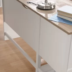 You spend a lot of time at your home office desk. Why not make the experience stylish and new but familiar and cozy? Make your home workspace somewhere you want to be with this L-shaped desk from the Cottage Road® collection. This home office desk features a spacious top surface for your computer, a lamp, and photos of your family. Two drawers with full extensions slides make this L-shaped office desk the perfect place for your home office essentials like pens, spare paper and a stapler. The lower drawer holds letter-size hanging files, so your most important documents are never far out of reach. A lower open shelf is featured for additional storage of books, binders, or a small storage bin. We know that keeping your home office desk tidy is important, that’s why the Cottage Road® wood L-shaped desk features two desktop grommet holes for easy electronic cord organizing. Finished on all sides for versatile placement in any room of your home, this desk with storage looks good no matter what angle you display it from. Finished in Soft White® with Lintel Oak® accents, this L-shaped desk will transform your home office into the friendly place you always wished it was.