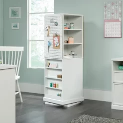 Never feel unorganized while crafting again – this craft tower from the Craft Pro Series has got you covered. Its swivel base allows it to easily spin and turn so you can access the storage spaces on any of the four sides. It includes a pegboard panel, a corkboard panel, two storage drawers with full extension slides, two adjustable shelves, and metal trays for additional storage. Talk about options! Finished in a sleek White, this handy storage tower gives your craft space the storage and convenience fit for a crafting pro!