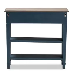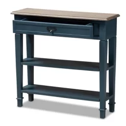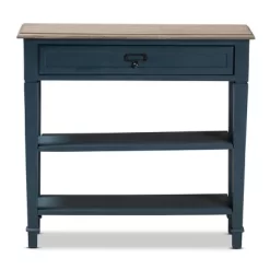 Featuring a stunning finish and plenty of storage space, the Dauphine console table unifies fashion and functionality. One drawer and two open shelves provide ample space to store books, candles, and other housewares. The tabletop is made from MDF wood and mindi-wood with a white-streaked natural veneer that complements the spruce finish on the drawer and legs. A vintage style metal tab pull completes the look. Place this table in the living room, kitchen, or any space in need of some antique charm. The Dauphine console table is made in Indonesia and requires assembly. Dimensions: 29.8″ High x 31.5″ Wide x 10″ Deep; Drawer: 3.3″ High x 20.1″ Wide x 6.5″ Deep