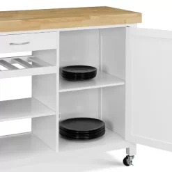This versatile rolling cart is a great addition to any kitchen. It allows you to easily transport your dishes and utensils where you need them. Stunning yet simple with is cheery white storage shelves and butcher block table top, for a look that brightens up any room. Straight legs and clean lines add a timeless look that fits with any kitchen or dining room decor style.