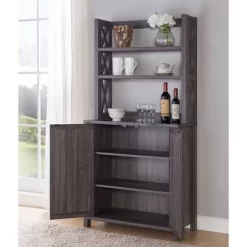 A layered structure gives this mid-Century modern buffet server a wonderful look and varied storage options. Sitting on canted feet, the unique buffet submits multiple open facades for arranging a variety of cocktails. Wine and stemware racks tend drinks for jubilant events, while cupboards with adjustable shelves closet seasonal serving platters and bowls.