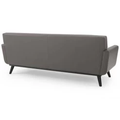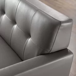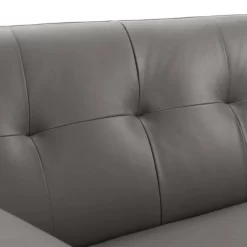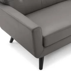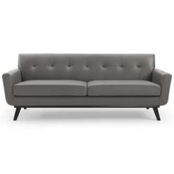 Gently sloping curves and plush removable seat cushions create a favorite living room couch. Whether lounging in solitude or entering a spirited discussion with friends, the Engage mid-century modern tufted top-grain leather upholstered living room lounge 90″ sofa is a welcome presence in your home. Seven buttons create eye-catching appeal, adding depth to a sleek retro modern living room sofa that brings your sitting décor to center stage. Four splayed wood legs and frame supply a solid base to the comfortable quality leather couch for your living room, lounge room, office or other seating area. Sofa Weight Capacity: 552 lbs.