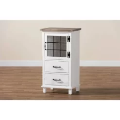 Organization is made easy with the charming Faron cabinet. Made in China, the Faron is comprised of a sturdy wood frame featuring a lightly weathered two-tone white and oak brown finish for an aged, vintage look. Two drawers and one compartment behind the door provide ample storage space to assist in organizing busy areas. Fully assembled, the Faron is adorned with antique inspired, black finished metal accents for a cool, industrial touch. A fantastic assistant to the modern household, the Faron cabinet adds value to any space. Dimensions: 35″ High x 18.9″ Wide x 13.8″ Deep; Drawer Dimensions: 5.3″ High x 13.2″ Wide x 11″ Deep; Storage Behind Door: 14.2″ High x 16.1″ Wide x 11.4″ Deep; Legs: 3.1″ High;