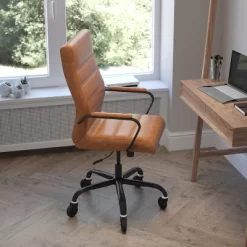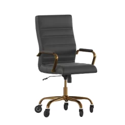 Comfort and style abound in this high-back LeatherSoft office chair with a complementary black frame and updated ball-bearing roller style wheels making it the perfect seating solution for your workspace. Crafted from premium materials, the ergonomic design brings a sleek look with ample durability and support for long-term use. Designed for exceptional comfort, this computer desk chair features a LeatherSoft upholstered, cushioned seat and back with padded arms for additional comfort. Horizontal stitching along the seat and back adds a touch of refinement that appeals in any space. The high-back office chair features extended height to support your upper back and help relieve back tension. A waterfall front seat edge removes pressure on your lower legs. Complete your custom fit with the pneumatic seat height adjustment lever and a tilt-lock mechanism for a rocking and reclining motion. Easily maneuver through a variety of tasks with the full 360-degree swivel seat atop transparent polyurethane roller style wheels with smooth ball-bearing motion. The classic styling pairs effortlessly with any office decor style, creating a comfortable and elegant impression that’s perfect for residential or corporate workspaces.