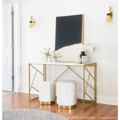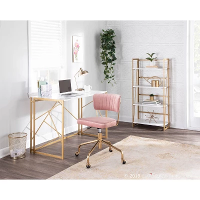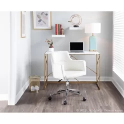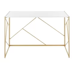 With its pleasant design and modern lines, the Folia Desk by LumiSource is a unique statement in any space. Featuring a gold metal frame and white wood top, the Folia Desk is sure to add a touch of glamour to your surroundings. Foldable for easy storage and mobilty with no-tool snap on assebly.