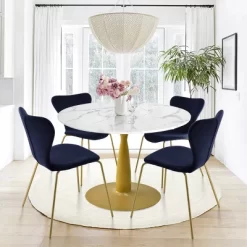 The Pop Maison modern dining table combined with sturdy metal pedestal base with a white Artificial marble top. The pedestal support base, not only beautiful but much more stable, were especially treated to be anti-rust and heavy-duty. It’s great for kitchen, patio, coffee, office etc. The pedestal structure design makes sure all the people around the table have enough space to put their legs in any comfortable position. Ergonomic chair with fresh color and velvet backrest. It applies high-quality materials: breathable velvet, padded foam, adding to the aesthetic value of the design as well as ensuring the stability of the chair.It can hold a person who weighs up to 250 pounds.