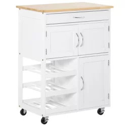 This rolling cart is an ideal option for any kitchen and dining space – no matter the size. It comes with a drawer, a 9-bottle wine rack, and two cupboards that provide plenty of room for holding everything together. Wheels allow you to move it where you desire. The rubberwood countertop is hard and durable and is ideal for prepping drinks and garnishes when friends come over. Make your house a home with HOMCOM.