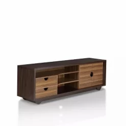 Add mid-century style to your living room with this 63 in. TV stand. Three open shelves are perfect for housing media and game components while two drawers, with unique cut-out handles, provide ample storage space for movies and games. Crafted of sturdy MDF materials with wood inspired rich finish, this console will accommodate most flat panel TVs up to 70 in. Showcase this simple yet sophisticated console in your living room, great room or dining room and it will become a favorite for years to come.