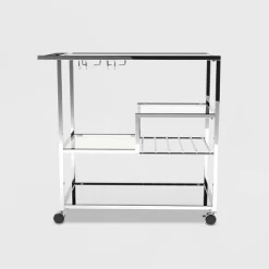 Host a wine and dine for close friends and impress with this chic glass serving cart. Three tempered glass shelves display hors d’oeuvres such a cheese, crackers, a bread basket, and fruits, while metal wine and stemware racks secure drinks. The bottom shelf is a mirror that reflects all the luster of this silver metal cart.