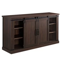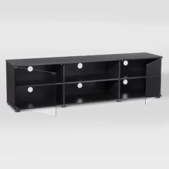 Elevate your entertainment space with the great-looking contemporary Room & Joy Kimmel TV Stand. Designed to accommodate up to a 70″ flat screen TV up to 120lbs., this TV Stand creates a sleek and stylish showcase for your home theater system. The TV Stand features multiple open shelves for numerous audio components. Two side cabinets provide additional concealed space for storing movies, music, video games, gaming controllers and other items. The Carson allows you to run wires easily and neatly through the large wire management holes in the back of the unit to keep all your components tangle free. The clean lines of this TV Stand and the matte black finish with silver metal accents makes this piece stand out in any room. After fully assembled, this stand is 20.5″H x 63″W x 15.75″D and is recommended to be assembled by 2 adults. This TV stand is constructed of particleboard and metal for a look that fits in with modern day style.