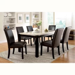 The stylish and contemporary Lanbert Marble Table Top Dining Table Dark Walnut by HOMES: Inside + Out has an air of extravagance at an affordable price. This glossy table features a beautiful genuine marble surface and sturdy wood frame with large block legs in a dark walnut finish. Add an eye catching look that sets apart an entertaining space.