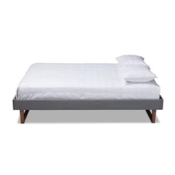 Warm wood tones are paired with soft fabric upholstery to give the Liliya bed frame a stylish and cozy feel. Built with a sturdy wood frame, the Liliya features a low platform upholstered in a soft, durable gray fabric that complements the walnut brown finish on the wood. Add some crisp white sheets and a plush duvet to complete the look. This bed includes wood slats, which eliminate the need for a box spring. The Liliya bed frame is made in Malaysia and requires assembly.