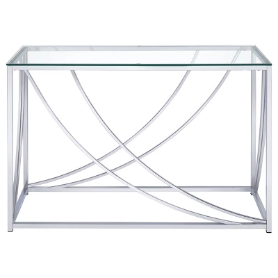 Full of clean lines and swooping curves, this modern sofa table adds depth to any living room or entryway. Bright and radiant, a shiny chrome finish dresses up the simple lines of the frame. The contemporary design of the decorative accents sets the smooth silhouette apart from the rest. Revel in the luxury and structure of the combination of a metallic base topped with glass. Create a visual focal point with the textures from this charming table.