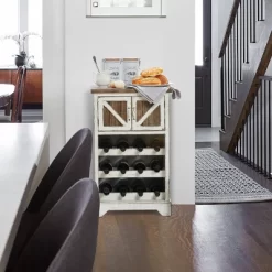 Welcome this country charmer to your home! A classic, farmhouse-inspired wine cabinet offers function and style in one piece. Keep your favorite red and whites displayed in the built-in wine rack. Crafted from fir and engineered wood in a distressed white finish with natural wood elements, this cabinet is the perfect complement to any rustic design. The cabinet has enclosed storage space hidden behind two doors that have a barn door inspired design. The enclosed cabinet space is perfect for storing bar ware and accessories, while the three shelves below accommodate nine to 12 bottles of your favorite vintages. The wine cabinet arrives fully assembled, and ready to use out of the box.