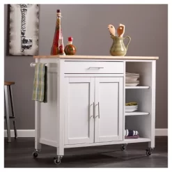 Keep your kitchen neatly organized while adding storage space with this Martinsen Kitchen Cart from Aiden Lane. Made from a sturdy rubberwood frame, this rectangle kitchen cart features a natural wood color tabletop and white cabinetry below to add a clean and classic look to your space. The built-in drawers and open shelves offer plenty of space for your plates, jars and other kitchen essentials, while the rack on the side provides a convenient spot to hang your kitchen towel. Whether you’re cooking a meal or serving your guests, you’ll love keeping all your kitchen essentials within reach in one spot. Plus, the attached caster wheels on the bottom make it easy to move this mobile kitchen cart around the room as needed.