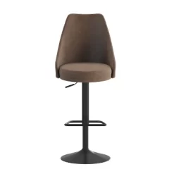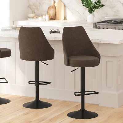 Modern styling and exceptional comfort make this set of two adjustable height stools the perfect addition to your kitchen or dining room. Soft, durable faux leather upholstered rounded backs with bucket style seats padded with high density foam contour to your body for total comfort. A sturdy pedestal base features an integrated footring to relieve leg pressure with a modern silhouette. Built to last, each stool holds up to 300 lbs. static weight with a pneumatic seat lift to adjust from bar to counter height. An embedded plastic ring in the base protects your indoor hard flooring surfaces. Assembly is quick and easy with the included materials. Wipe these stools clean with a dry cloth.