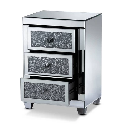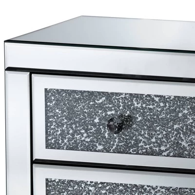 Accent your space with the elegant style of the Ralston end table. Made in China, the Ralston is comprised of a wood frame fitted with mirrored glass for a graceful style that adds beauty to any space. Three spacious drawers are embedded with stunning floating crystals that easily catch and reflect light. Fully assembled, the end table also features crystal drawer knobs for added glamour. An eye-catching design that efficiently organizes a variety of household essentials, the Ralston end table is an exceptional addition to any home. Overall Dimensions: 26″ High x 18″ Wide x 14″ Deep; Legs: 2″ High; Drawers: 12.25″ Wx 11″ D x 4.5″ H;