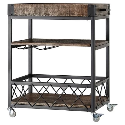 Keep your party supplies organized and at the ready with the Ronay Bar Cart. This industrial-chic serving cart has a rustic-yet-relaxed style, plenty of storage space and smooth wheels for rolling with the party. With two locking wheels this bar cart can remain sturdy and in one place when needed.