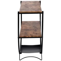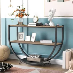 Classic accent table fits perfectly in any living room. Its base showcases a demilune shape awash in an antique black finish and a metal lower shelf lends a touch of industrial charm. Two tiers of wood shelving offer large space for your books, magazines, and decor. Two support feet and the steel frame make it stable and durable.