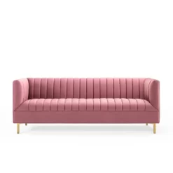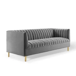 Engage the flowing lines of the Shift Channel Tufted Performance Velvet Living Room Sofa for a subtle elegance that enhances your living room decor. Shift features interior vertical channel tufted details that adds visual depth to this glam deco sofa. Luxuriously soft and stain-resistant performance velvet upholstery covers this living room sofa for an elegant piece at home in your living room, lounge room, or office seating area. The Shift Velvet Sofa rests securely on four gold stainless steel legs with non-marking foot pads to protect flooring. Assembly Required. Sofa Weight Capacity: 900 lbs.