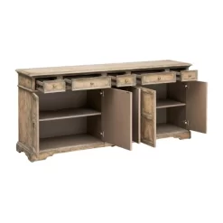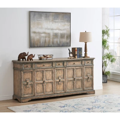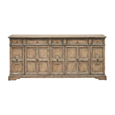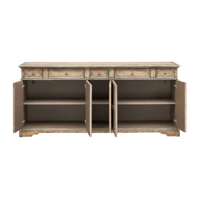 Add a touch of drama and sophistication with this spacious five-door credenza. Five drawers and three fixed shelves create the perfect space for creative storage, while the wooden exterior is topped with a stunning rubbed finish that complements any décor. With an expansive display area on top, this beautiful Credenza will be a welcome addition to any room.