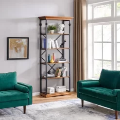 86.5″ Juanita 6 Tier Etagere Wood And Metal Open Bookcase Distressed Wood – Danya B.